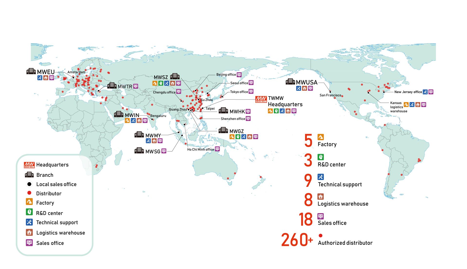 自創(chuàng)立以來,明緯即以「心懷善意」的精神,及「信賴夥伴」的信念持續(xù)與客戶、供應商、協(xié)力廠及員工保持長期的合作關(guān)係,我們藉由與全球超過260家授權(quán)經(jīng)銷商建立的堅強夥伴關(guān)係,穩(wěn)定地成長與茁壯,2024年已成為合併營收達10.22億美金 以上的專業(yè)電源品牌製造商,全球總部位於臺灣新北產(chǎn)業(yè)園區(qū),在中國廣州、深圳、蘇州、美國(加州/密蘇里州/紐澤西州)、歐洲荷蘭、印度、新加坡、香港、馬來西亞以及土耳其皆設(shè)有分公司及辦事處,全球員工人數(shù)達2500人。目前擁有5座生產(chǎn)基地,分別位於臺灣新北市、中國廣州花都區(qū)、中國蘇州市相城區(qū)、印度邦加羅爾以及美國堪薩斯城。