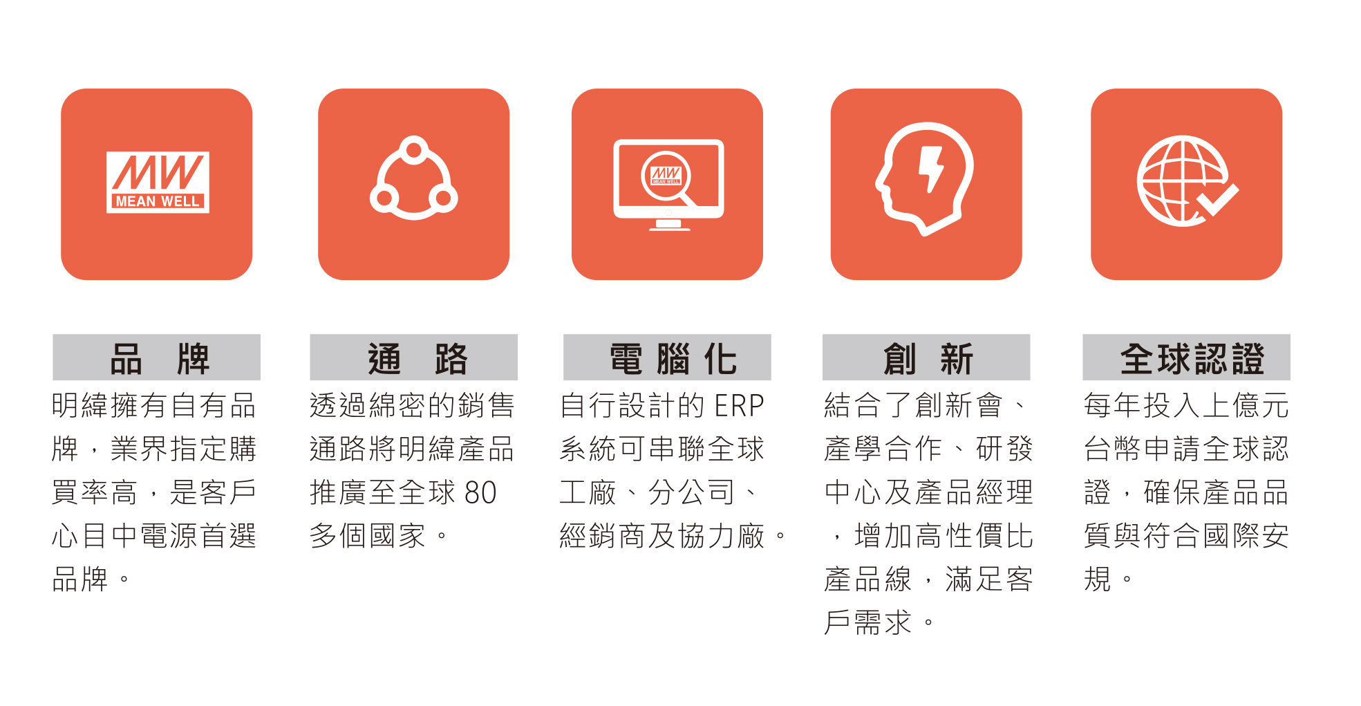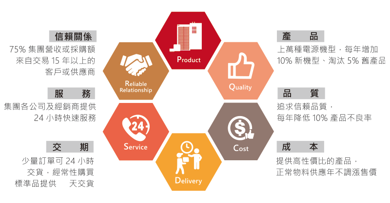- 提供客戶/經銷商一次購足的電源解決方案(One Stop Shopping & Total solution)