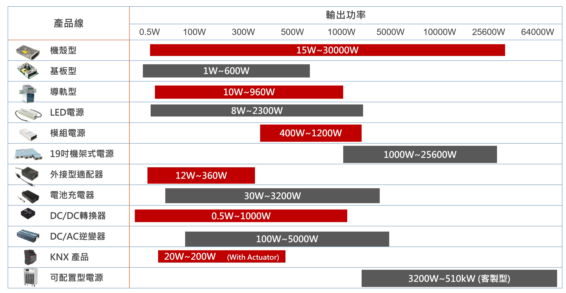 明緯秉持著持續創新的精神,每年新增10%新品,至今提供全方位之電源供應器產品,瓦特數涵蓋 0.5W~25,600W,主要產品類別有 AC/DC 電源供應器、LED驅動電源、AC/DC 充電器、DC / DC轉換器和DC / AC 逆變器,提供廣泛產品類別以滿足不同產業客戶之應用需求。