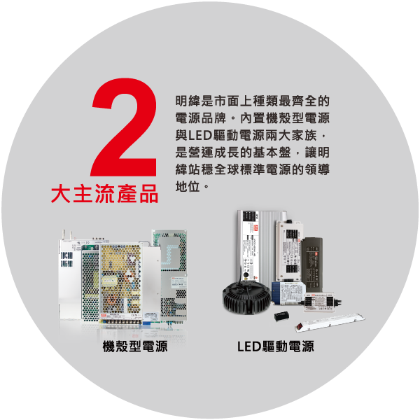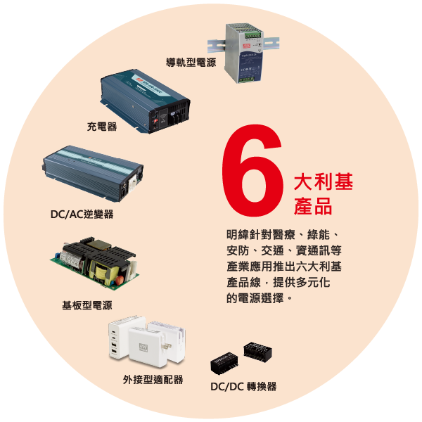 明緯秉持著持續(xù)創(chuàng)新的精神,每年新增10%新品,至今提供全方位之電源供應(yīng)器產(chǎn)品,瓦特?cái)?shù)涵蓋 0.5W~25,600W,主要產(chǎn)品類別有 AC/DC 電源供應(yīng)器、LED驅(qū)動(dòng)電源、AC/DC 充電器、DC / DC轉(zhuǎn)換器和DC / AC 逆變器,提供廣泛產(chǎn)品類別以滿足不同產(chǎn)業(yè)客戶之應(yīng)用需求。