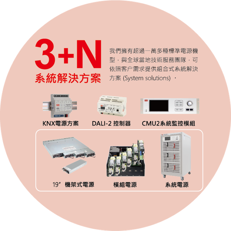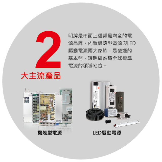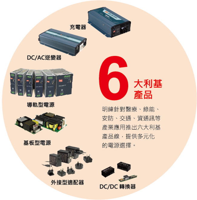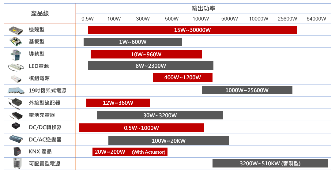 明緯秉持著持續創新的精神,每年新增10%新品,至今提供全方位之電源供應器產品,瓦特數涵蓋 0.5W~25,600W,主要產品類別有 AC/DC 電源供應器、LED驅動電源、AC/DC 充電器、DC / DC轉換器和DC / AC 逆變器,提供廣泛產品類別以滿足不同產業客戶之應用需求。