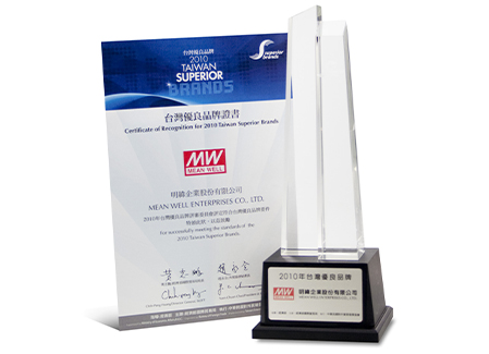 2010年,明緯榮獲經(jīng)濟(jì)部國(guó)際貿(mào)易發(fā)展局頒發(fā)「2010臺(tái)灣優(yōu)良品牌獎(jiǎng)」,創(chuàng)辦人林國(guó)棟先生代表明緯集團(tuán)領(lǐng)獎(jiǎng),此獎(jiǎng)肯定明緯長(zhǎng)期深耕自有品牌的努力與成果。