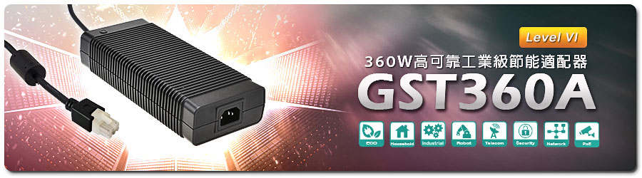明緯GST家族自2015陸續上市18~280W,現已年銷數百萬臺並廣受好評,為因應外接式電源更高功率需求,新推出了市面上少有的360W高功率Level VI節能適配器~GST360A系列。