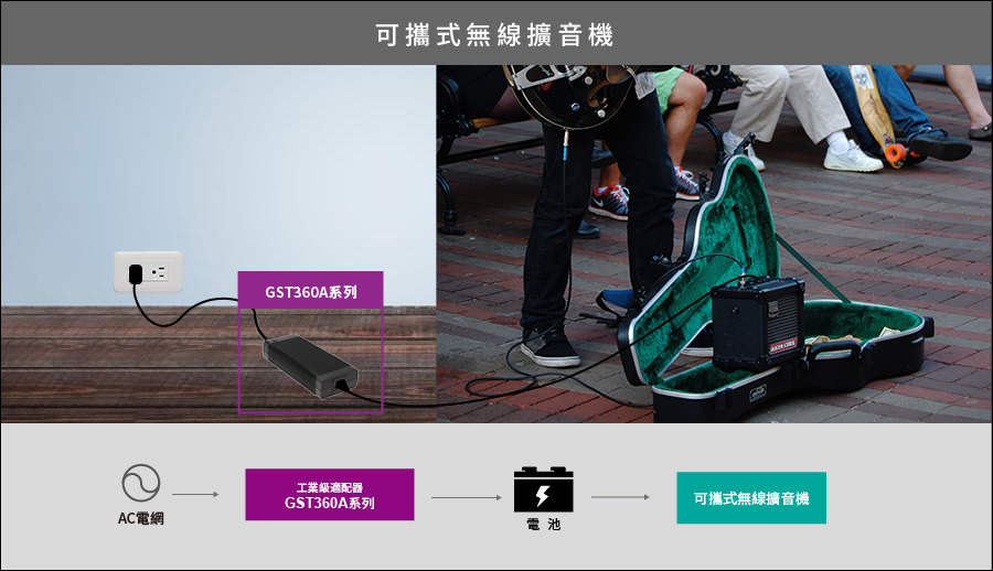 GST360A系列有別於市售消費性等級適配器,採工業級耐用、適用全球各國、環保節能概念設計,本系列額定功率360W,可供載450W (3秒)、可使用在-30~+70℃各種環境溫度、嚴選用料提供3年保固、擁有多國環球認證、並通過Level VI國際能效標準,因此不論在空載待機時或使用中,皆能有效地達到節能減碳之目的。 該系列適用於商辦設備、工業儀器或需要符合能耗標準之各類系統,如: 3D列印機、POS系統、遊戲機、可攜式擴音機、移動式舞臺燈、PoE …等。