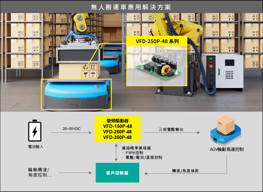 全系列 VFD 驅(qū)動(dòng)控制器採(cǎi)無風(fēng)扇設(shè)計(jì),無噪音、效率最高達(dá) 93%、並可提供 200% 峰值電流;內(nèi)建完整保護(hù)功能,符合國(guó)際安規(guī) IEC/EN61800-5-1 及電磁兼容 IEC/EN61800-3 標(biāo)準(zhǔn)。適用於具有風(fēng)扇及空調(diào)、抽排煙設(shè)備、水泵、AGV、電動(dòng)工具、自動(dòng)門或機(jī)械設(shè)備裝置、輸送帶、醫(yī)療器材、健身器材…等採(cǎi)用直流無刷 BLDC 馬達(dá)的終端系統(tǒng)及產(chǎn)品。