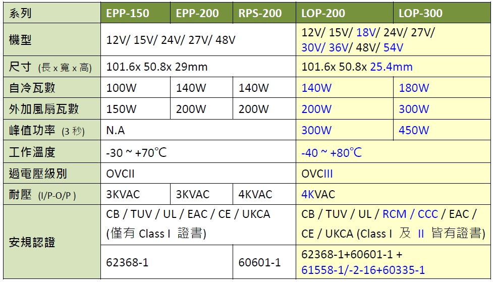 LOP-200/300 系列相較於銷(xiāo)售中 EPP-150/200、RPS-200系列,主要差異詳如下表,包含薄型化 (1" 高)、12~54V 電壓更齊全、 4" x 2" 尺寸下功率推升至 300W、具備 150% @3 秒供載能力、-40~+80℃工作溫度更寬、符合 OVCIII、一機(jī)同時(shí)擁有 62368-1/ 60601-1/ 61558-1/ 60335-1 各種安規(guī)認(rèn)證,可涵蓋應(yīng)用領(lǐng)域更廣,適用於資通訊電子儀器、醫(yī)療裝置、工廠自動(dòng)化、家用裝置…等應(yīng)用。