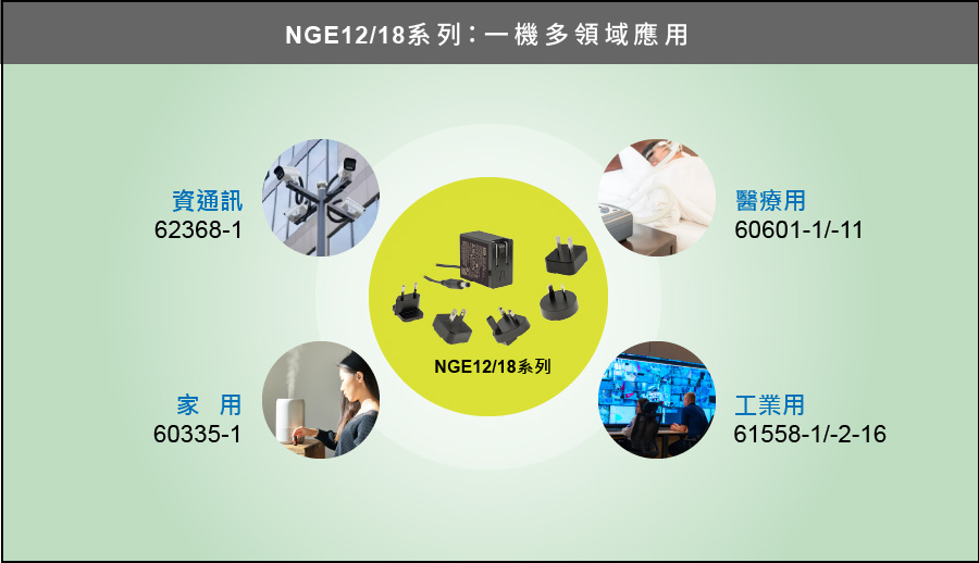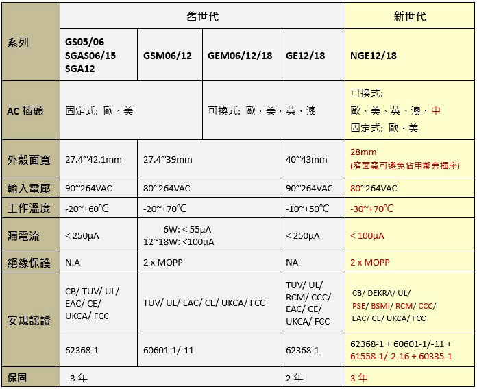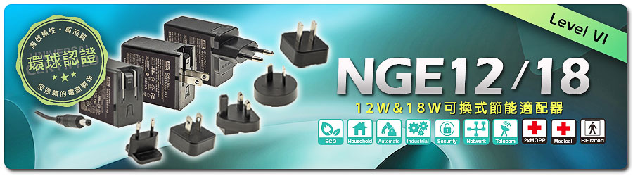 NGE12/18 相較於上市多年的 5~18W GE/ GEM/ GS/ GSM/ SGA/ SGAS 等系列,最大差異是一機同時擁有 62368-1/ 60601-1/ 61558-1/ 60335-1 等各應用領域安規,並增加了CCC/ BSMI/ PSE認證、其窄面寬 (28 mm) 設計可避免佔用鄰旁插座、寬溫 -30~+70℃ 使用國家或安裝空間較不受限、整體設計符合 2xMOPP 並適用醫療 BF 類...等 (詳細差異如下表)。本產品是一款高品質、壽命長、認證齊全的插牆式節能適配器,非常適用於各種消費性電子、商旅用裝置、或任何需跨國搭配可換式 AC 插頭等電子產品應用。