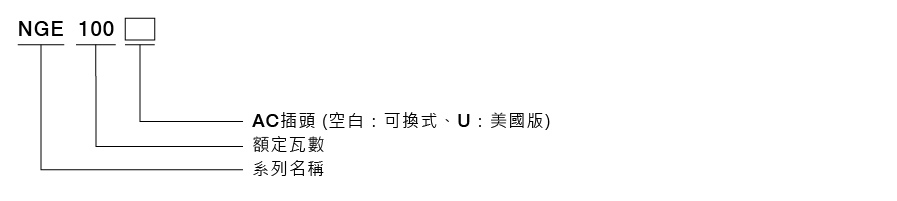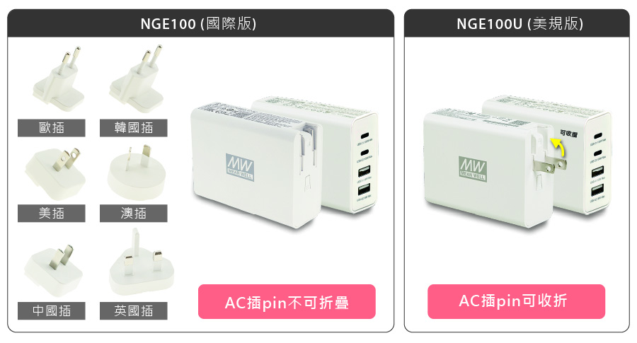 NGE100U (美規(guī)版):AC 插頭可收摺,不可變換其他國(guó)家插頭