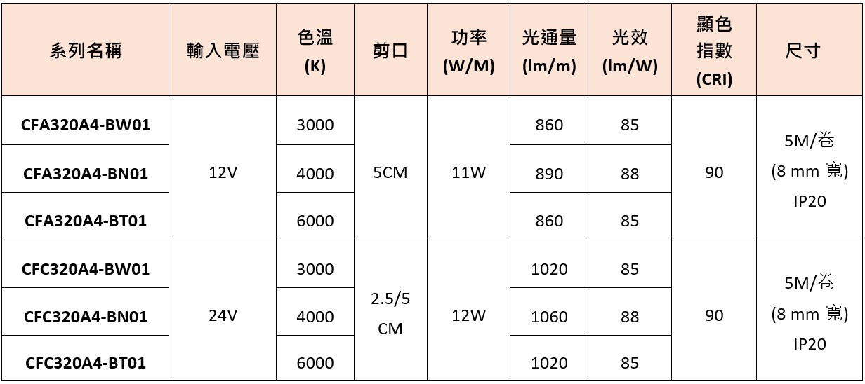 木林森 (MLS) CF 系列 COB LED 燈帶規格: