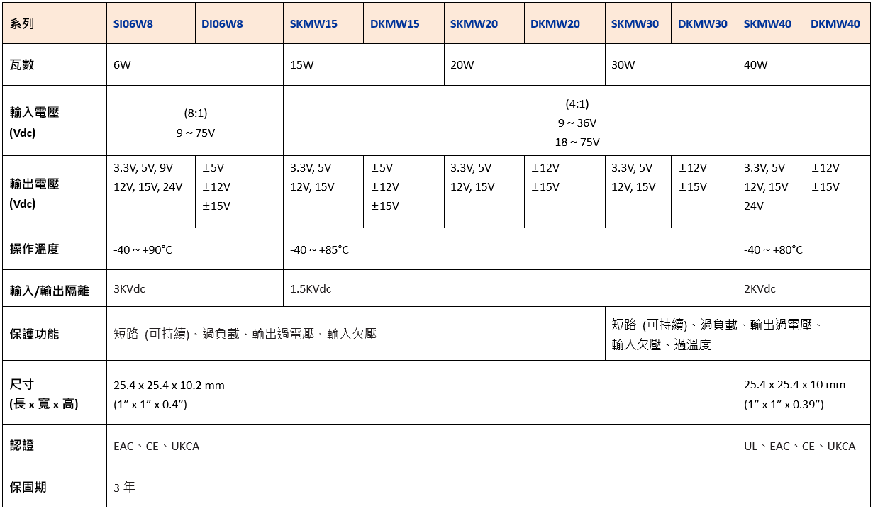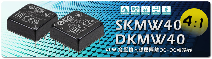 明緯繼推出 1" x 1" 6W/15W/20W/30W 寬壓輸入 DC-DC 轉換器後廣受好評,為滿足 1" x 1" 更高瓦數的需求,新推出了 4:1 輸入 40W 的單組輸出 SKMW40 及雙組輸出 DKMW40 系列。