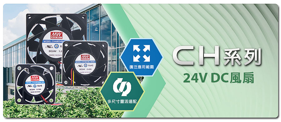 為因應(yīng)更多元應(yīng)用場(chǎng)域的電壓需求,聯(lián)源精密 在既有12V DC風(fēng)扇產(chǎn)品線的基礎(chǔ)上,正式推出明緯品牌24V DC風(fēng)扇 — CH系列。