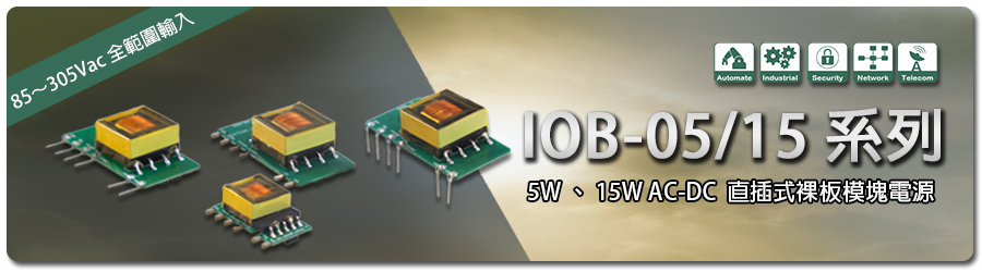 IOB-05/15 系列是一款體積小巧、性能穩定的AC-DC 裸板型模組電源,產品主要特點:小型化設計、85~305Vac 全範圍輸入,可相容全球電網、超低待機功耗 <0.15W,節能環保、-40~+85℃超寬工作溫度範圍、完整多重保護功能,可確保設備安全運行、特別適合安裝於空間受限的儀器設備內的PCB基板上,如:工業自動化、電力儀錶、智慧家居…等應用。