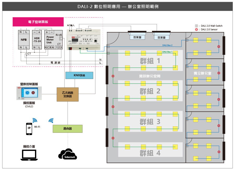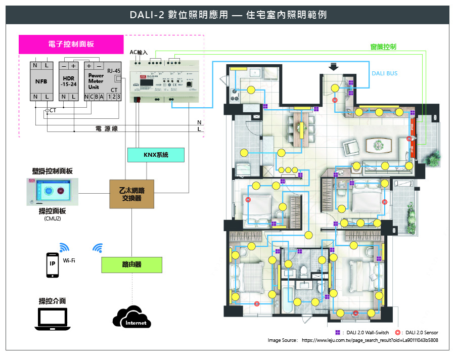 隨著5G及智慧居家產(chǎn)品的發(fā)展趨勢,數(shù)位照明系統(tǒng)及樓宇自動化的應(yīng)用,越來越受到關(guān)注。如何有效整合大樓或智慧居家所有的照明系統(tǒng),同時結(jié)合樓宇自動化的控制,將是未來發(fā)展的趨勢。跨入(B.A)樓宇自動化系統(tǒng),明緯除了提供KNX樓宇自動化系統(tǒng)相關(guān)產(chǎn)品之外,我們正式推出符合DALI-2規(guī)範(fàn),數(shù)位控制的照明系統(tǒng)DLC-02控制器;以及可有效整合進(jìn)KNX樓宇自動化系統(tǒng)(KNX轉(zhuǎn)DALI Gateway)的產(chǎn)品—DLC-02-KN,使用者可依場域規(guī)模,選擇合適的產(chǎn)品做搭配。