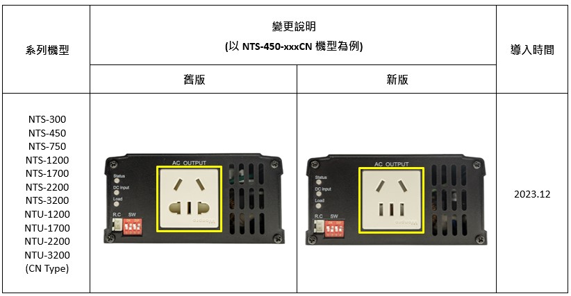 因應(yīng)中國國家標(biāo)準(zhǔn)新規(guī)定,AC 插座型式需變更為五孔插座 (詳如下),明緯逆變器 NTS/NTU 系列的中國插機(jī)型需按國家新標(biāo)準(zhǔn)變更,變更後不影響逆變器原功能特性。將自 2023.12 起出貨導(dǎo)入新版,新舊版會(huì)有庫存品出貨轉(zhuǎn)換期,本次變更售價(jià)不調(diào)整,若您對本次產(chǎn)品變更有任何疑問,請您與明緯業(yè)務(wù)代表聯(lián)繫。