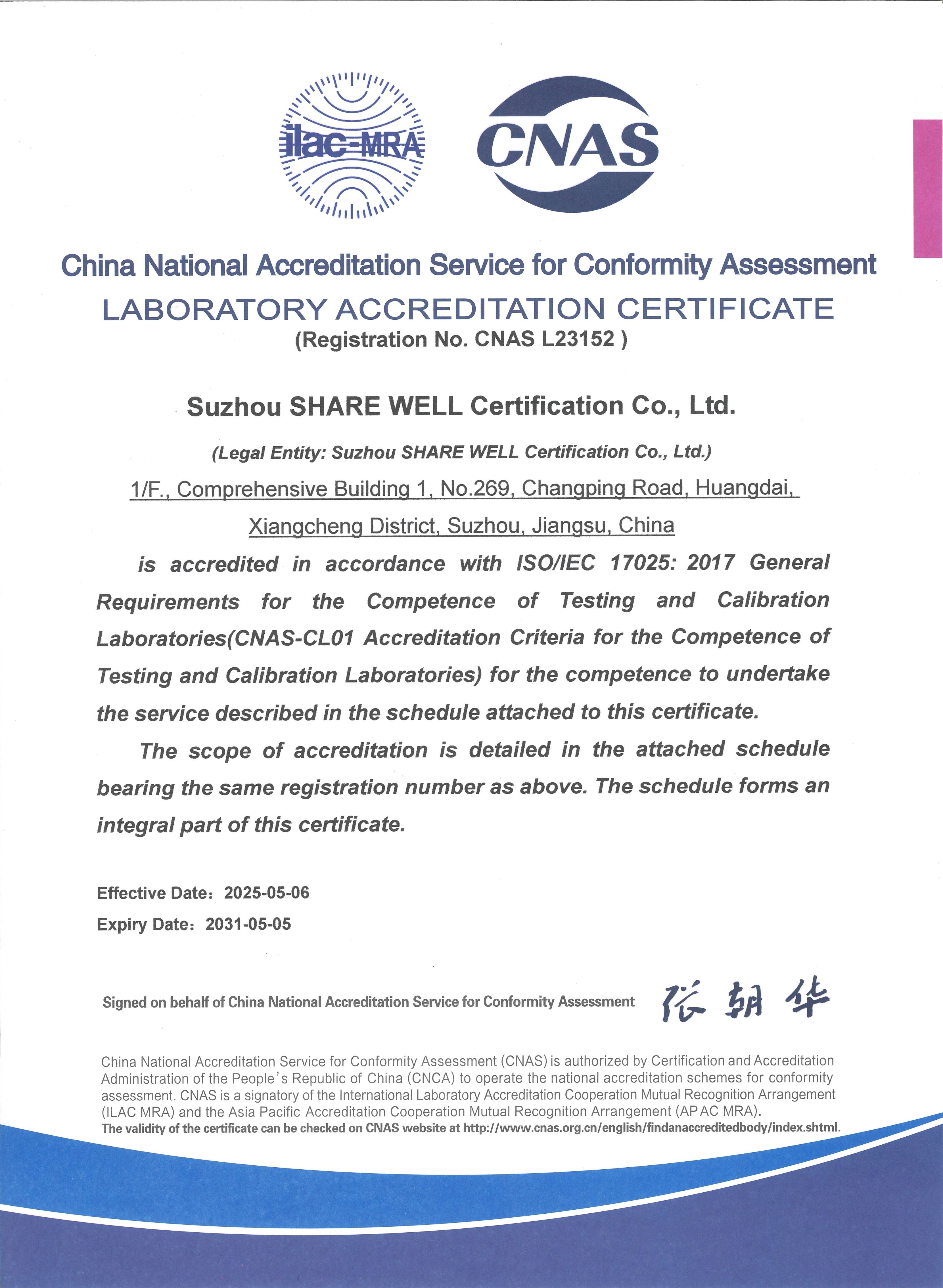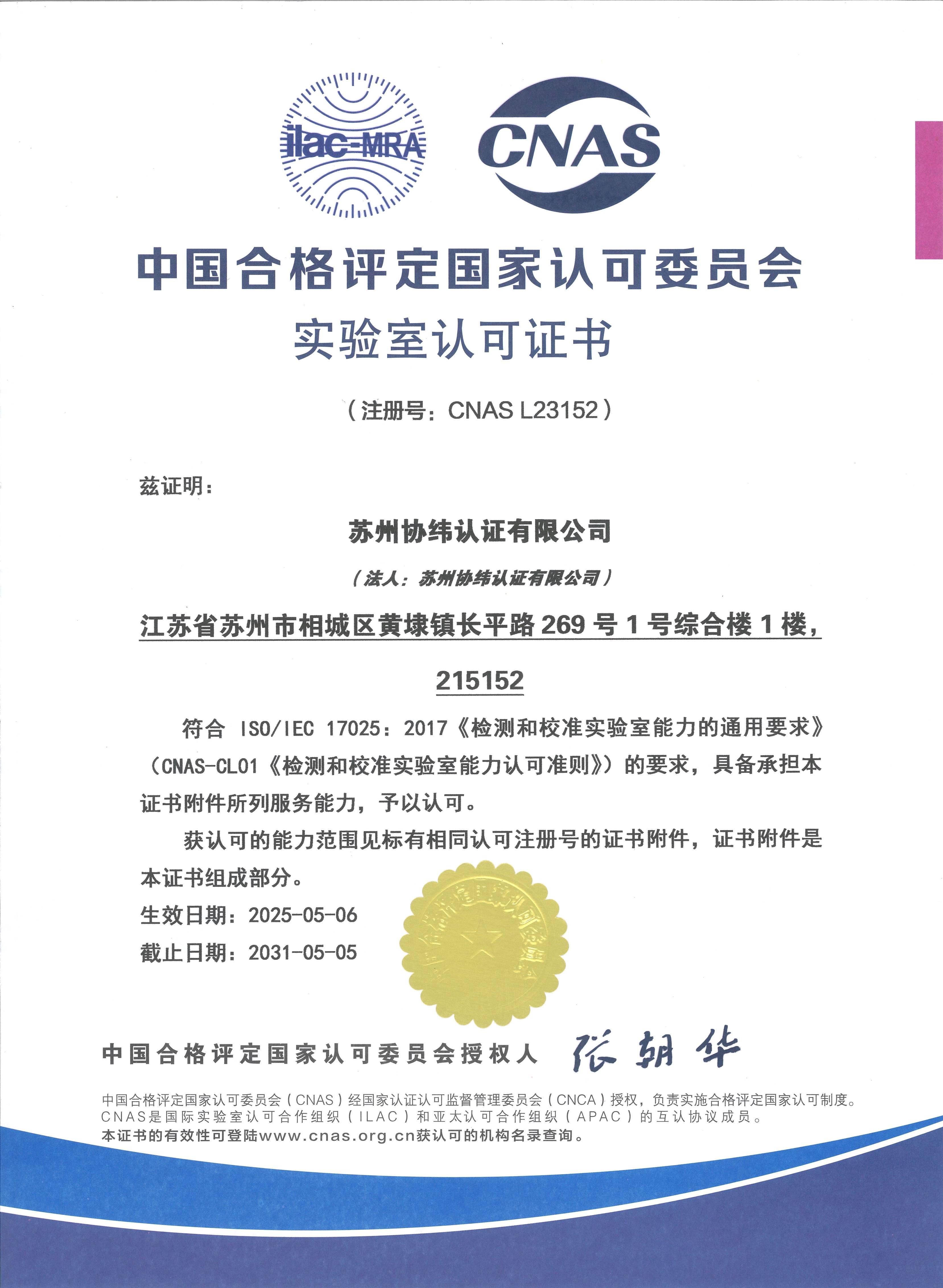 2025年5月6日蘇州協(xié)緯認(rèn)證有限公司正式獲得中國(guó)合格評(píng)定國(guó)家認(rèn)可委員會(huì)(CNAS)頒發(fā)的實(shí)驗(yàn)室認(rèn)可證書(註冊(cè)號(hào):CNAS L23152)。這標(biāo)誌著該實(shí)驗(yàn)室在電磁兼容檢測(cè)領(lǐng)域的技術(shù)能力和品質(zhì)管制體系已達(dá)到國(guó)際水準(zhǔn)。