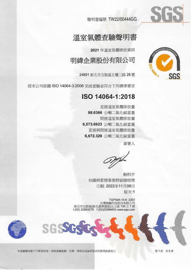 明緯集團本次盤查範圍為臺灣總部(包含辦公室及產線),查驗期間2021/1/1-2021/12/31,盤查類別1~4(3~4為部分盤查),總CO2排放量為6,672公噸,盤查結果已於今年11月10日通過第三方SGS查驗,並取得ISO14064-1:2018聲明。