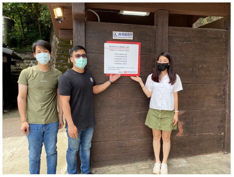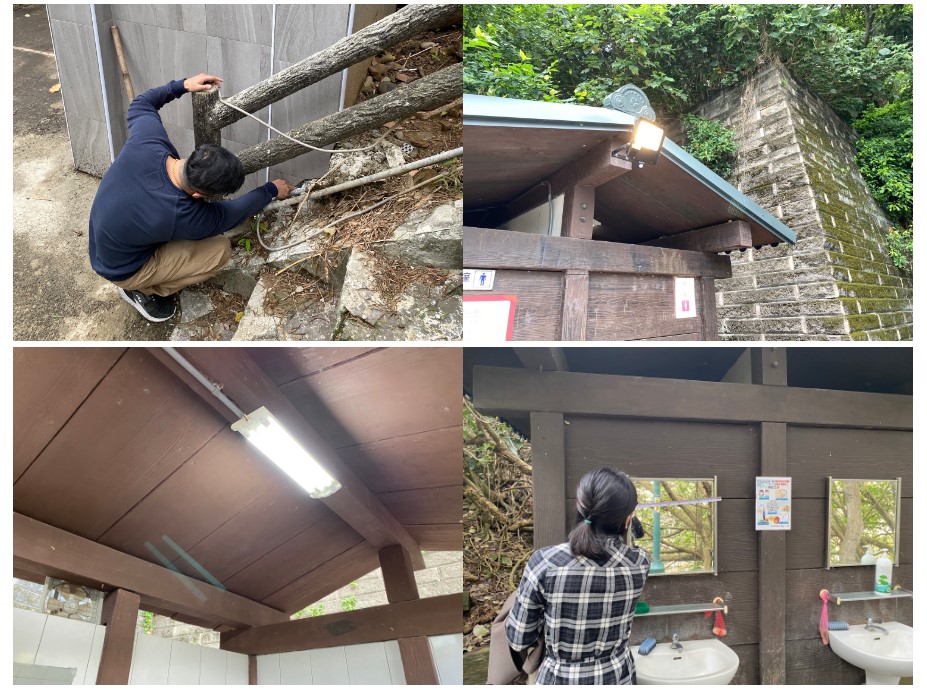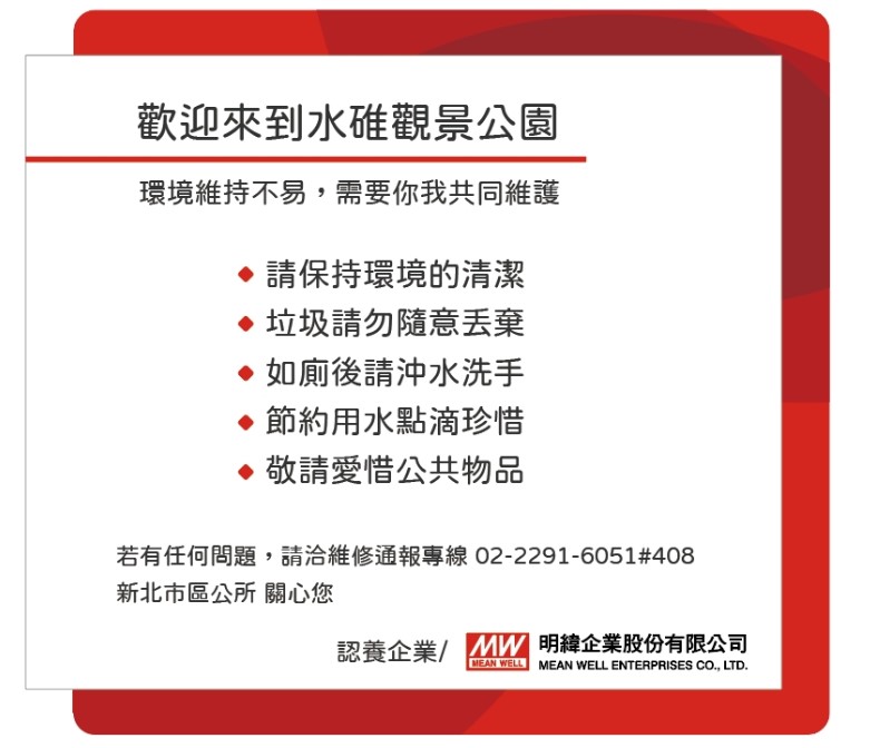明緯認養鄰近集團總部的五股水堆公園三座公廁,認養項目除提供衛生用品及清潔耗材、增設環境維護宣導標語、執行定期現場巡檢等明緯結合電源產業本業的經驗與經銷夥伴協力合作,改善公廁整體照明,汰舊公廁的傳統燈具改為LED燈具並增設感應燈具,達成節能減碳,亦提高了公廁照明亮度及安全性。