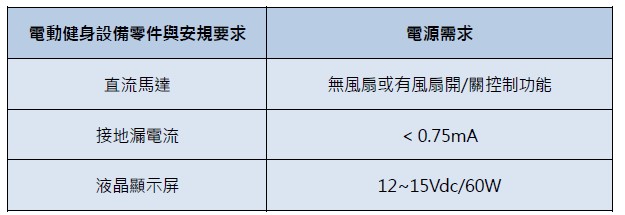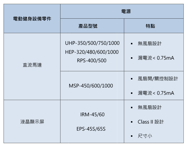 因此,電動健身設備需要無風扇或有風扇開/關控制功能和低漏電流的電源,在選擇電源時,建議考量上述的需求。MEAN WELL產品線齊全,提供各種符合電動健身設備電源需求的產品型號,詳細產品資訊可參考下表。
