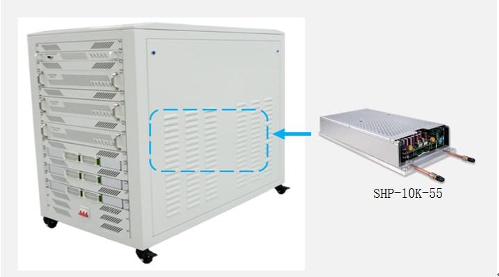 如圖三是將SHP-10K-55安裝在固態微波源的設備內,提供非常穩定的直流電壓能量給功率級微波能量線路,系統提供可控且精準的微波能量給相關設備使用,如工業微波加熱設備、工業微波乾燥設備、微波等離子體設備等。