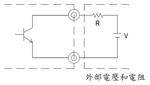 以下為一簡易外部線路外加一直流電壓源 V 與限流電阻 R: (最大供電電壓為 50VDC,最大吃載電流為 30mA)