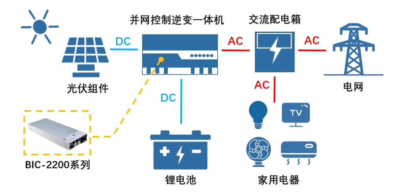 家用儲能系統(tǒng) (如圖 2.),主要包括光伏元件、鋰電池、並網(wǎng)控制逆變一體機(jī)和家用電器等。在夜間把電力系統(tǒng)的低價電力,通過一體機(jī)內(nèi)部的 BIC-2200 對鋰電池充電儲能;在白天電網(wǎng)高負(fù)荷的時候,鋰電池再經(jīng) BIC-2200 反向輸出能量並回饋至電力系統(tǒng),不僅可以削峰填谷,減輕電網(wǎng)波動,還能為家庭節(jié)省電力開支。