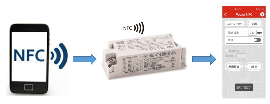 明緯近期推出新一代 XLN/XLC-NFC 系列產品,用戶可使用具有NFC功能的智能裝置,在產品沒有 AC 輸入的情況下,透過明緯 APP 近距離感應快速設定輸出電流,以匹配不同燈具應用。