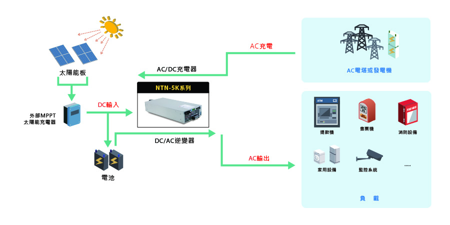 家用儲(chǔ)能系統(tǒng)在現(xiàn)代生活中扮演著越來越重要的角色,它不僅可以幫助用戶提供緊急用電,搭配太陽能板與太陽能充電器則可以同時(shí)節(jié)省能源費(fèi)用,還能為環(huán)境保護(hù)出一份力。下圖展示了一個(gè)基本的家用儲(chǔ)能應(yīng)用配置,這個(gè)配置包含了明緯 NTN-5K 逆變器和適用的電池,透過儲(chǔ)能來應(yīng)對電力需求,為家庭提供穩(wěn)定可靠的電力供給。