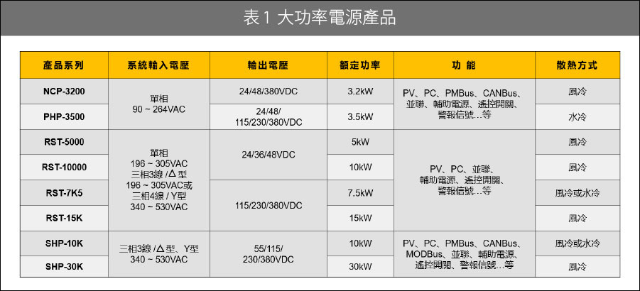 明緯持續研發大功率開關電源,單體電源涵蓋 3.2kW ~ 30kW,輸出電壓/電流可透過 PV/PC 功能靈活調整,或透過通訊介面如 CANBus / PMBus / MODbus 等進行設定與監控,另外有風冷/水冷兩種散熱方式可供選擇。如下表 1 為明緯大功率電源產品: