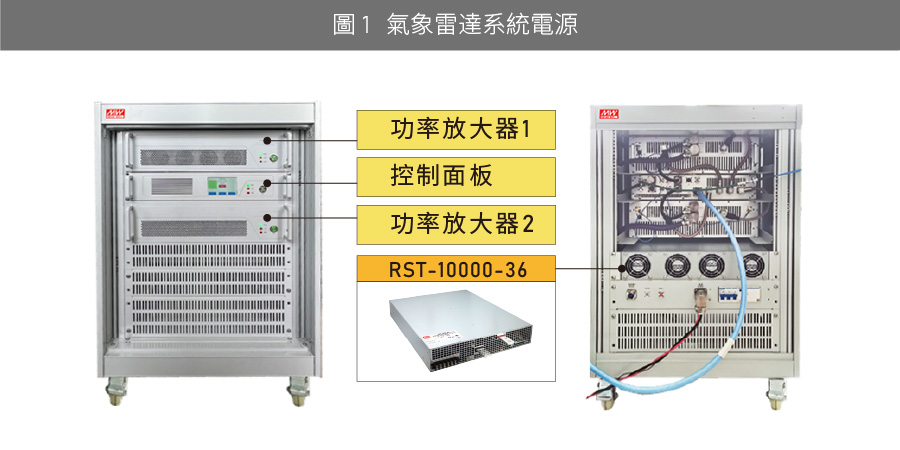 如下圖 1 為氣象雷達系統電源應用,負載為射頻功率放大器。使用明緯 RST-10000-36 + 15U 機櫃,組合成一套完整氣象雷達系統電源,採用類比警報訊號,以監控電源工作狀態。