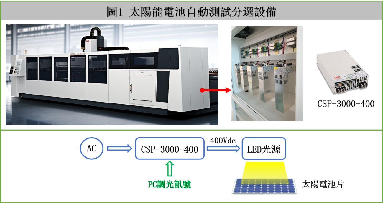- 如下圖 1 為太陽能電池自動測試分選設備。內部使用 5 組獨立 LED 光源陣列,以模擬太陽光的光譜和光照強度,並配備資料讀取與計算、電子負載等設備,用於測試光伏器件 (如太陽能電池片等) 的性能,包括轉換效率、V-I 特性等。每組 LED 光源為 400Vdc/2000W,由 5 臺 CSP-3000-400 獨立恒流驅動,使用 PC 電壓訊號穩定調整光照強度