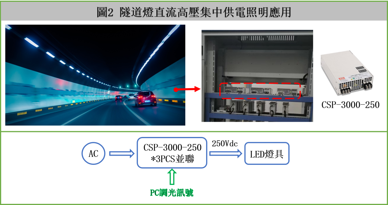 - 如下圖 2 為隧道燈直流高壓集中供電照明應用。隧道入口對光照亮度要求高,採用 7.5kW 高壓燈具 (VF:210~250Vdc),由 3 臺 CSP-3000-230 並聯恒流驅動,使用一組 PC 電壓訊號同步調光