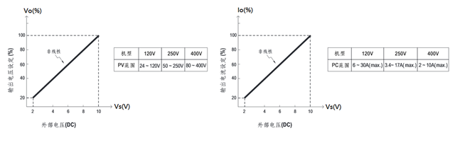 在PV模式下,有三種可以調整Vo的方式,第一種方式是藉由SVR2調整,其調整範圍為額定電壓的20~100%。第二種方式是在CN2的PIN7/PIN8之間外加一直流電壓訊號Vs,其調整範圍為額定電壓的20~100%,請參考圖六所示;若Vs<2V,則Vo≧額定電壓的10%。第三種方式是在CN2的PIN5/PIN6之間外加一直流電壓訊號Vs,其調整範圍為額定電壓的8~100%,請參考圖八所示,範圍較寬,且響應速度較快。