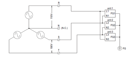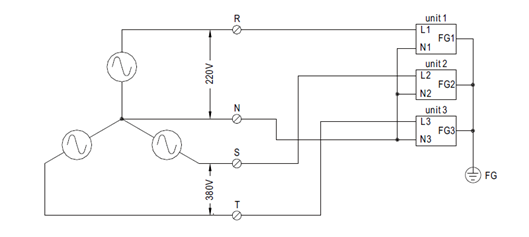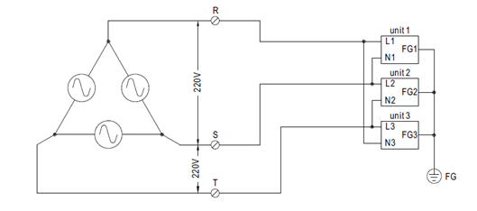 若三相平衡問題不是主要議題或客戶可以搭配其他系統負載讓三相電源達到平衡,客戶也可以任取兩相線電壓直接接到單相交流電源輸入的產品,如圖六~圖八中VR-S / VS-T / VT-S對單一臺Unit的L / N配線;但需確認其交流電壓值須介於產品的輸入電壓範圍。在實務上,終端客戶若搞不清楚其電力系統到底是屬於哪一種?則可以直接拿數位三用電表量測任兩條線的電壓值,只要介於產品的輸入電壓範圍即可。