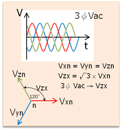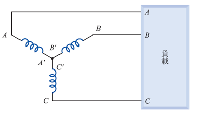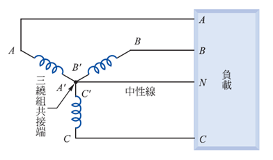 三相系統繞組的接法,有星形(Y)跟三角形(?)兩種。星型接法是將三繞組的一端接在共同點N,另一端則分接在負載端,如圖三所示。共同點N稱為中性點,若由中性點接出引線,並接在負載端,則接在負載端有四條接線,稱此接法為三相四線式系統(3Φ4W)。如圖四所示,若中性點沒有引線接出,則稱為三相三線式系統(3Φ3W)。一般是將中性點接地,以大地代替中性線,好處是可加裝保護設備,以增加安全性。星形接法相與線的電壓、電流關係為: