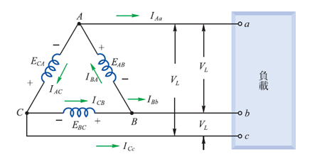 三角形接法是將三繞組的頭、尾兩端,接在負載相對的頭、尾兩端,各對應間形成一封閉迴路,如圖五所示。三角形接法因沒有中性端引出接線,接線的方式只有三相三線式(3Φ3W)。其相與線的電壓、電流關係為: