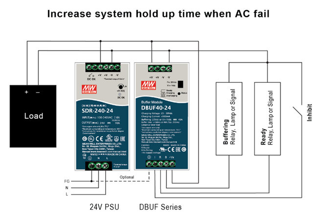 明緯推出的DBUF系列,搭載緩衝動作訊號。當輸入電壓失效,導致輸出電壓不足緩衝模組開始動作時,DBUF緩衝模組內建的繼電器將會啟動,可供使用者做微系統進行資料儲存的偵測的依據,藉此達到資料的即刻救援,解決使用者對於設備可靠度的需求。