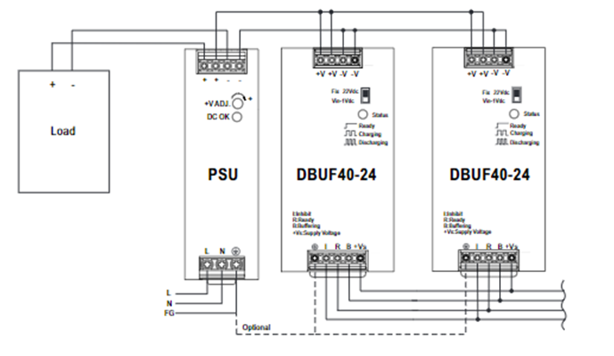 緩衝模組與不斷電系統有諸多差異,如表一。由於緩衝模組內部是由電容組成,因此,有著小型化、低成本且免維護等優點。此外,UPS有毫秒級的反應時間,相較之下,緩衝模組則無此問題。緩衝模組內部電容與電源輸出端採直接並聯的形式如圖三,當電源輸出失效時,緩衝模組內的電容可即時供電,讓客戶有足夠時間進行資料儲存。緩衝模組特別適用在資料處理相關設備,或者工業電腦供電設備。倘若終端設備負載量較大,或需較多時間儲存資料時,緩衝模組亦能並聯使用,如圖四。