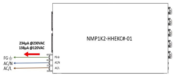 圖1顯示了明緯單臺(tái)模組電源產(chǎn)品 NMP1K2-HHEKC#-01的漏電流測(cè)試結(jié)果,該機(jī)型由24V,12V,48V和5V四個(gè)輸出模組組成。