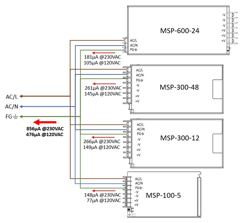 圖2顯示了使用四臺(tái)單輸出電源時(shí)的總漏電流,四臺(tái)機(jī)型分別為MSP-600-24、MSP-300-12、MSP-300-48與MSP-100-5。