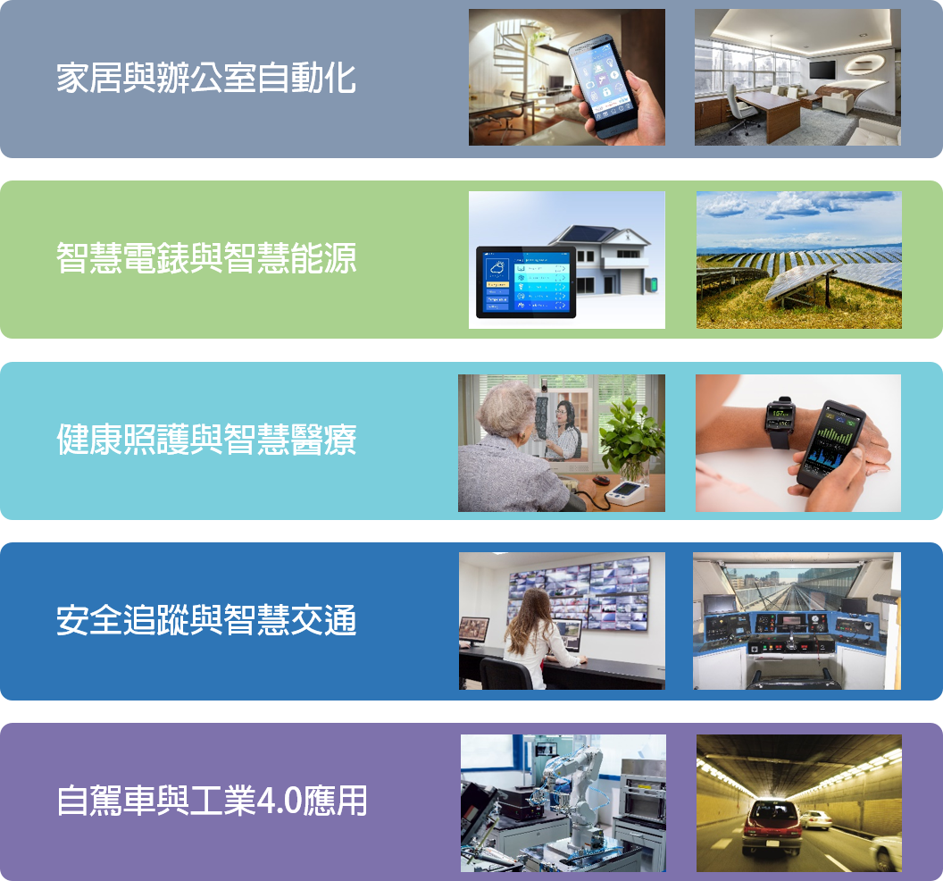 隨著5G時代的來臨,物聯網(Internet of Things)主流應用朝向家居與辦公室自動化、智慧電表與智慧能源、健康照護與智慧醫療、安全追蹤與智慧交通以及自駕車與工業4.0應用等方面發展。