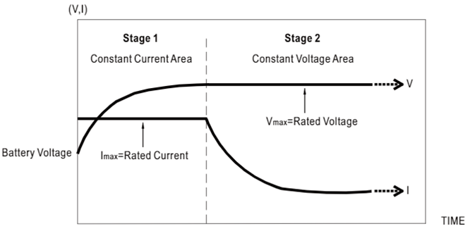 單一的鋰電池額定電壓可在3.2 V 到4.4V之間。最大充電電流可達1C。需注意不同廠商生產的相同化學成分鋰電池也往往有不同的額定電壓及電流。客戶需根據電池規格為準。與鉛酸電池不同,鋰電池不接受高於自身額定電壓的充電壓且自放電速率極低。因此鋰電池常選用無浮充模式的二段式充電(圖二)