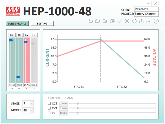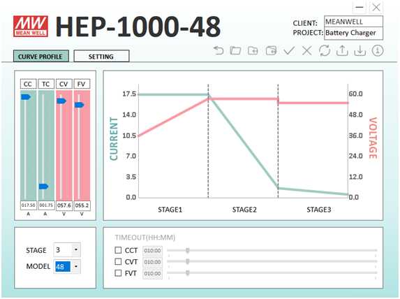 使用者只需要在軟體中選擇二段式充電模式,HEP-1000-48便可用於鋰電池充電,可調整的電壓及電流範圍不變。例如給一顆20Ah,最大充電電壓為56V的磷酸鋰鐵電池充電,使用者可將圖四所示的‘CV’及‘CC’選項調至56V及17.5A。如此可得到最快速的充電方案。使用者也可以選擇較低的恆流點避免高電流導致的高溫和較低的恆壓點以保證不會過度充電。
