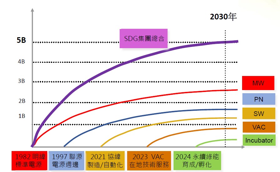 2020年12月12日,明緯第一本專書「信賴夥伴的力量」新書發表會上,SDG集團創辦人林國棟先生首度公開提出成立「SDG集團」的想法,SDG集團由經歷近40年耕耘的明緯集團為基礎,並以明緯公益基金會作為價值核心,發展第二品牌聯源集團,投資外部合作夥伴並輔導成為 ESG 企業,作為明緯集團經銷商販售上下游產業產品,以進出口貿易型態,整合資源取得最佳性價比商品,透過全球通路與分公司銷售 ;協緯集團則著重中國地區發展,各子公司間互相支持產生綜效,並以蘇州智慧園區為基地,負責生產與製造高性價比標準產品,提供SDG 集團內部企業與夥伴使用或外部銷售為主 。